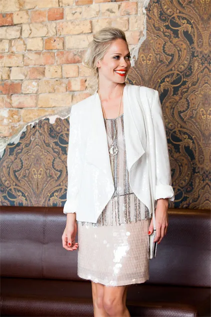 Sequins: If you’re not into bold colours but love to shine, sequins are a dazzling option. Nude and white tones give a fresh look and allow the sparkle to do all the work. Beaded tassel camisole $199 (6 18), sequinned blazer $179 (6-18), both from Max. Sequinned skirt $89.99 (6-16), tassel necklace $34.99, both from Portmans. Zigzag bag $39.99 from Equip.