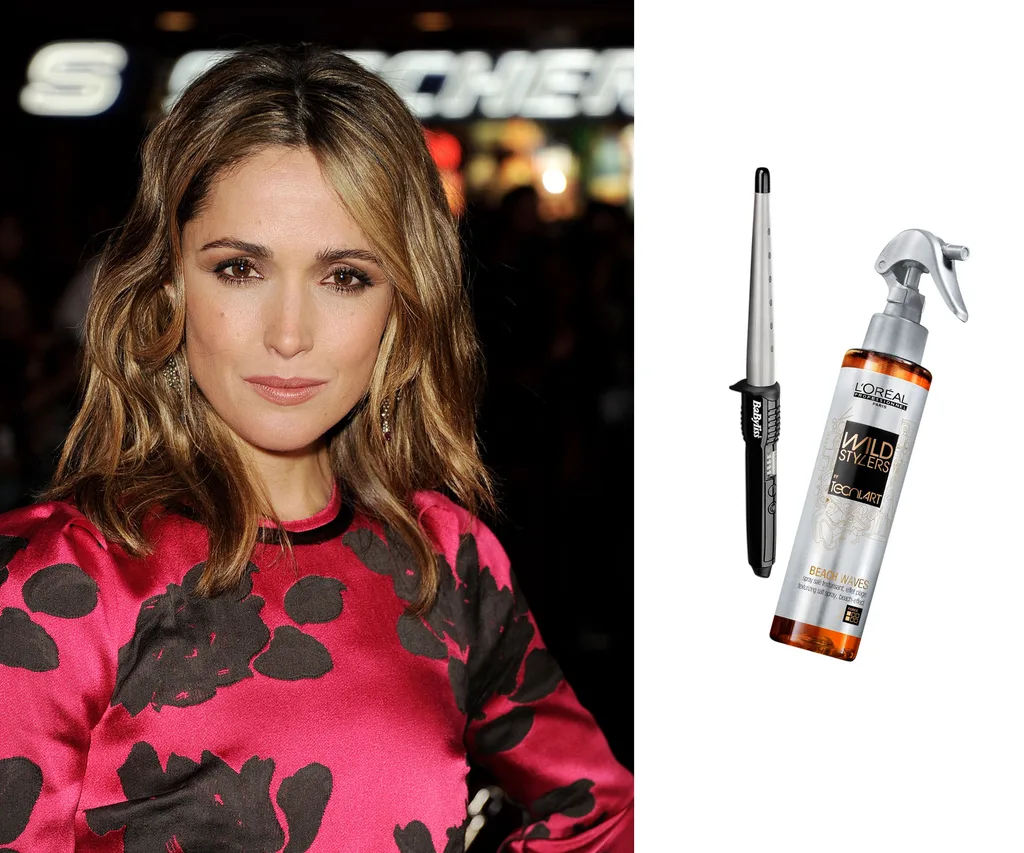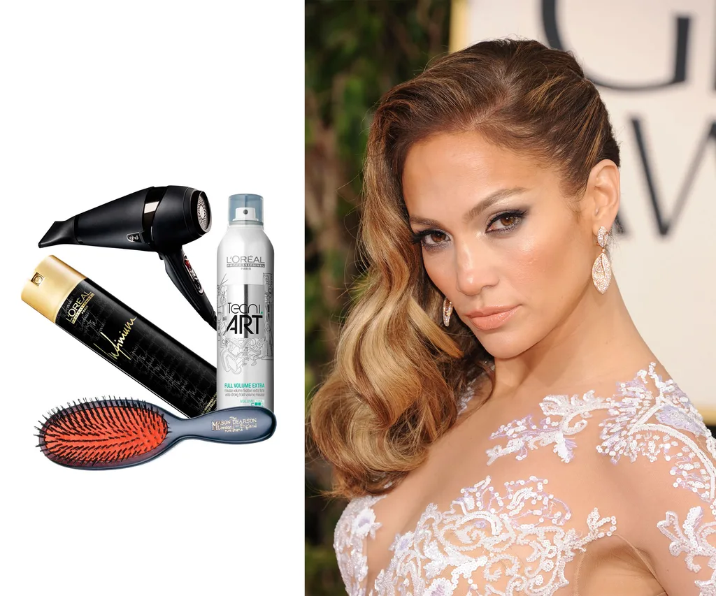 Tool: “Use a hairdryer with a large natural bristle brush to encourage shine and create more ‘air’ in the hair. I then use a large barrel curling tong and curl all the hair; clip up as you go to help keep volume and root lift. Tip your head upside down and brush thoroughly before applying product. Flip head back and voilà… sex kitten hair!”