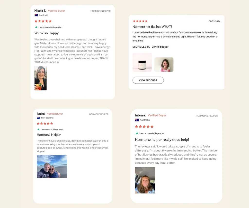 Nicole E. from Australia shares, “I’m starting to feel like myself again. Clearer head, more energy, calmer mood, hot flushes gone. Thank you Mister Jones!”