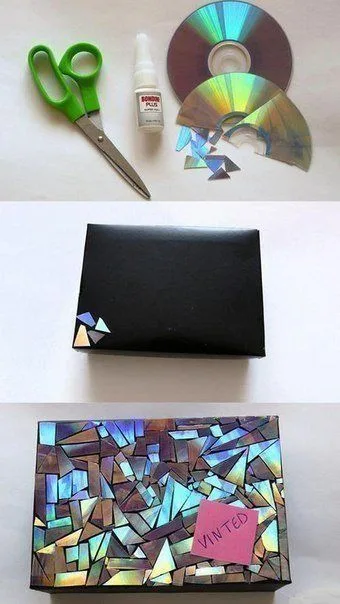 Take some old CDs, snip them into random segments, then superglue them onto a corkboard or within a frame. Et voila, your very own mini piece of wall art. Via Homesthetics.