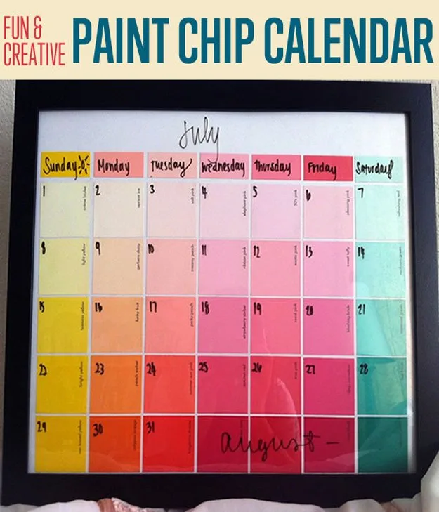 Reuse the paint sample papers you get from the DIY store by turning them into a cool calendar you can mount on the wall. All you need is a large frame, the paint sample papers and a dry marker to write over the top of the glass. And the bonus is you can reuse this again and again. Via DIY Ready.