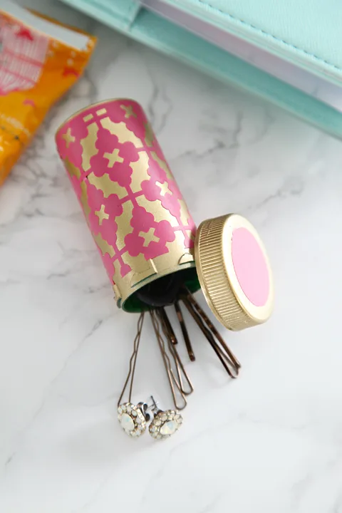 Reuse old pill bottles by painting or covering them in decorative paper – then use it to store small items in your bag that easily get lost, ie. Kirby grips, earrings and keys. Via I heart organising.