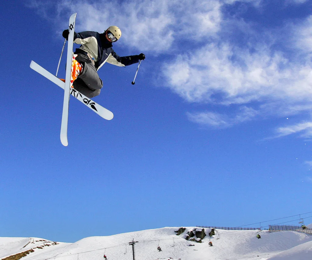 Sam Hazledine pulling a 360-degree tail grab in the terrain park at Cardrona. He was 2003 New Zealand Freeskier of the Year.