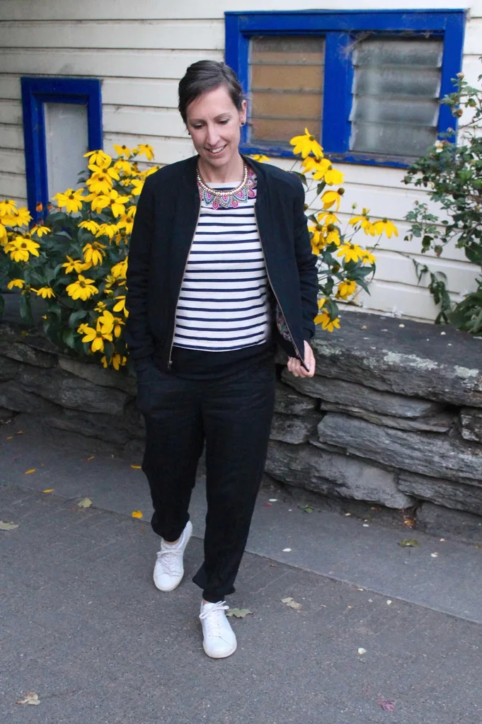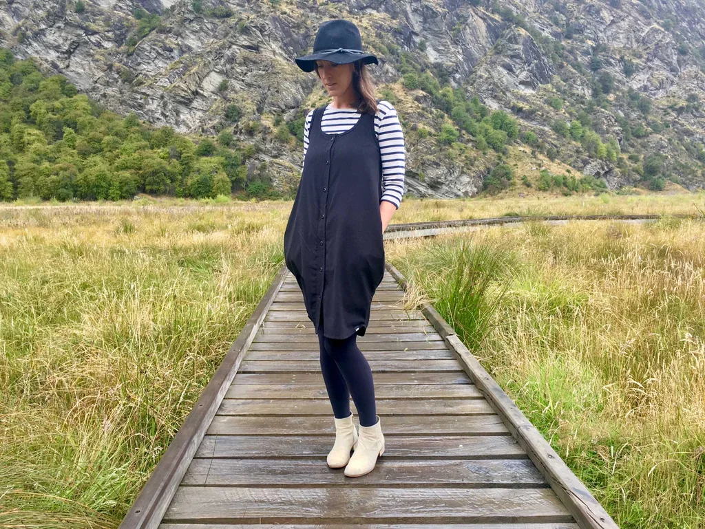 The final six to make the cut included: 1) A pair of black smart-casual silky harem pants; 2) A violet linen skirt with a boho feel; 3) A black dress from Kilt Clothing that could be cinched in at the waist to create a tulip style skirt; 4) and 5) From Kowtow, a Breton-stripe three-quarter top and black V-neck tee, both organic cotton, and 6) A white short-sleeved cuffed and hemmed light cotton blouse with very light accents of lavender, that sat well over the pants and over and under the dress/skirt. As per the challenge rules, I was also allowed one jacket for colder weather. Living in Queenstown, this was a must. I opted for a floral tapestry bomber jacket that, fully lined in black, was reversible.
