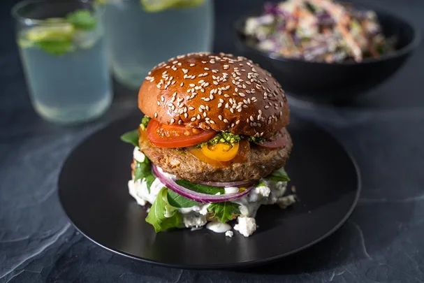 To assemble: slather tzatziki onto the bottom of each bun then scatter on crumbled feta. Top with rocket and salad greens, red onion, a lamb pattie and tomato. Spoon on a generous amount of pesto on top, then top with brioche bun. Serve while hot.