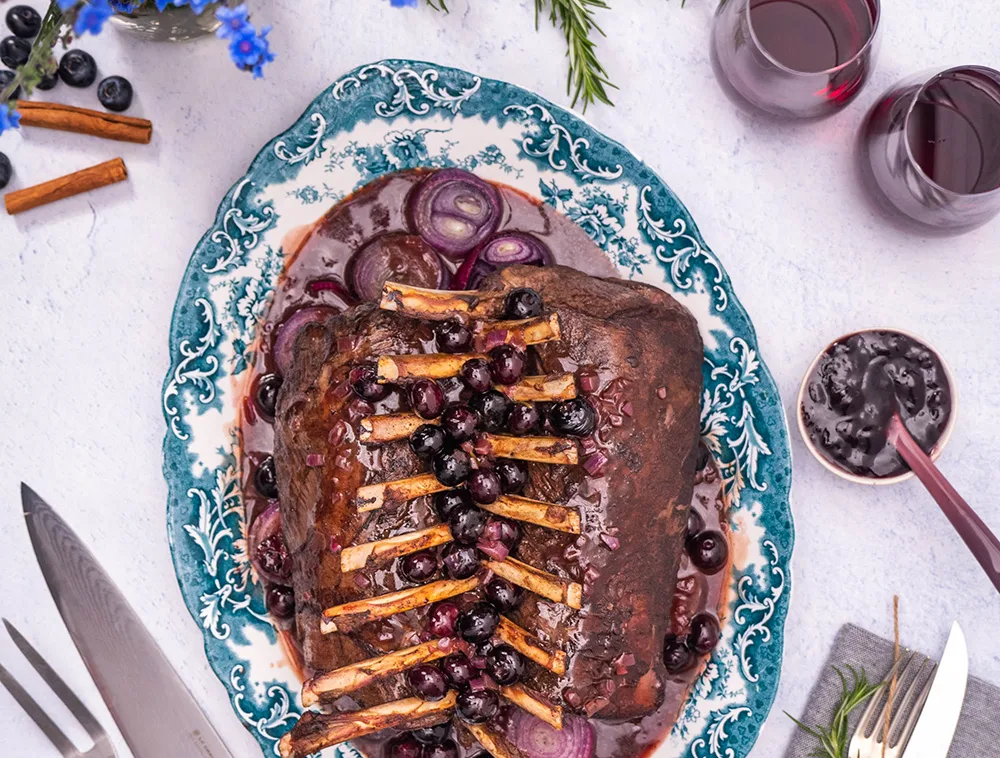 Transfer venison racks and roasted red onions to a serving platter. Pour over the blueberry sauce. Serve with blueberry chutney and glasses of pinot noir.