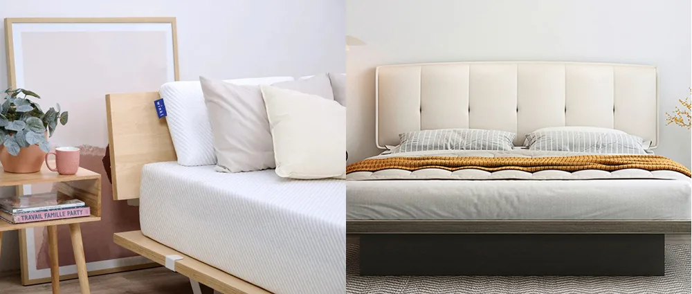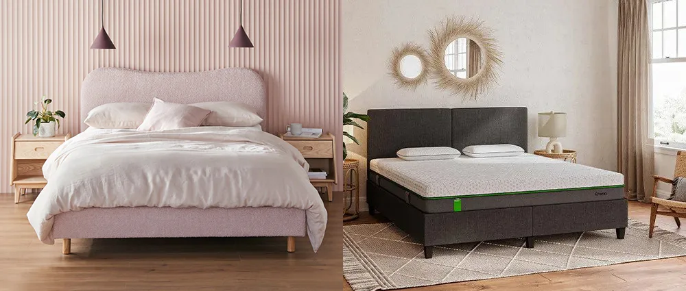 From left: Drift Modern Bed Frame (queen), $900 (usually $1,200) from Ecosa. Emma Signature Bed Frame (queen), $1569.15 (usually $3,487) from Emma Sleep.