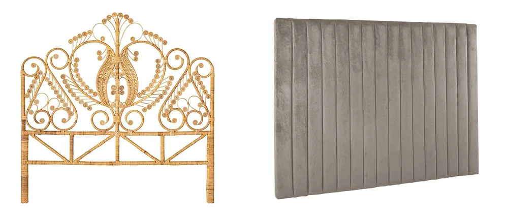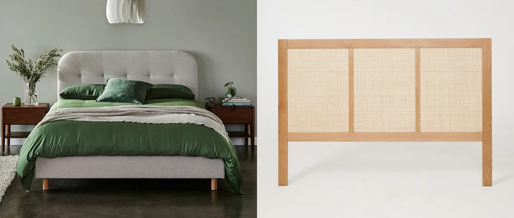 From left: Marais Rattan Bedhead (queen), $419 (usually $529), from Early Settler. Takaka Vertical Headboard (queen), $524 (usually $699), from Freedom Furniture.