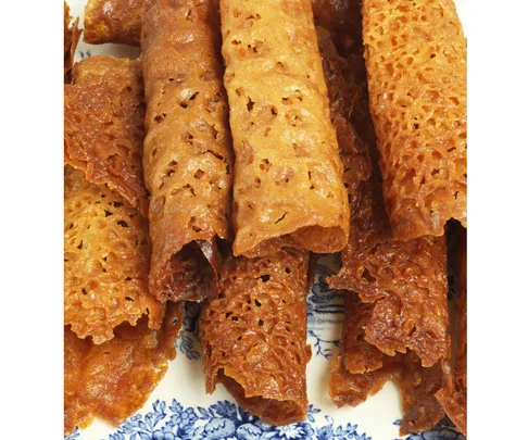 3 Bake in a 200°C oven for five to seven minutes. Keep a close eye on them as they will burn very quickly because of the high sugar content. Pull them out when they are uniformly dark golden brown. While they are baking, grease the handles of three wooden spoons ( I only had two so I used a cylindrical knife sharpener as well) and have a wire cooling rack ready.