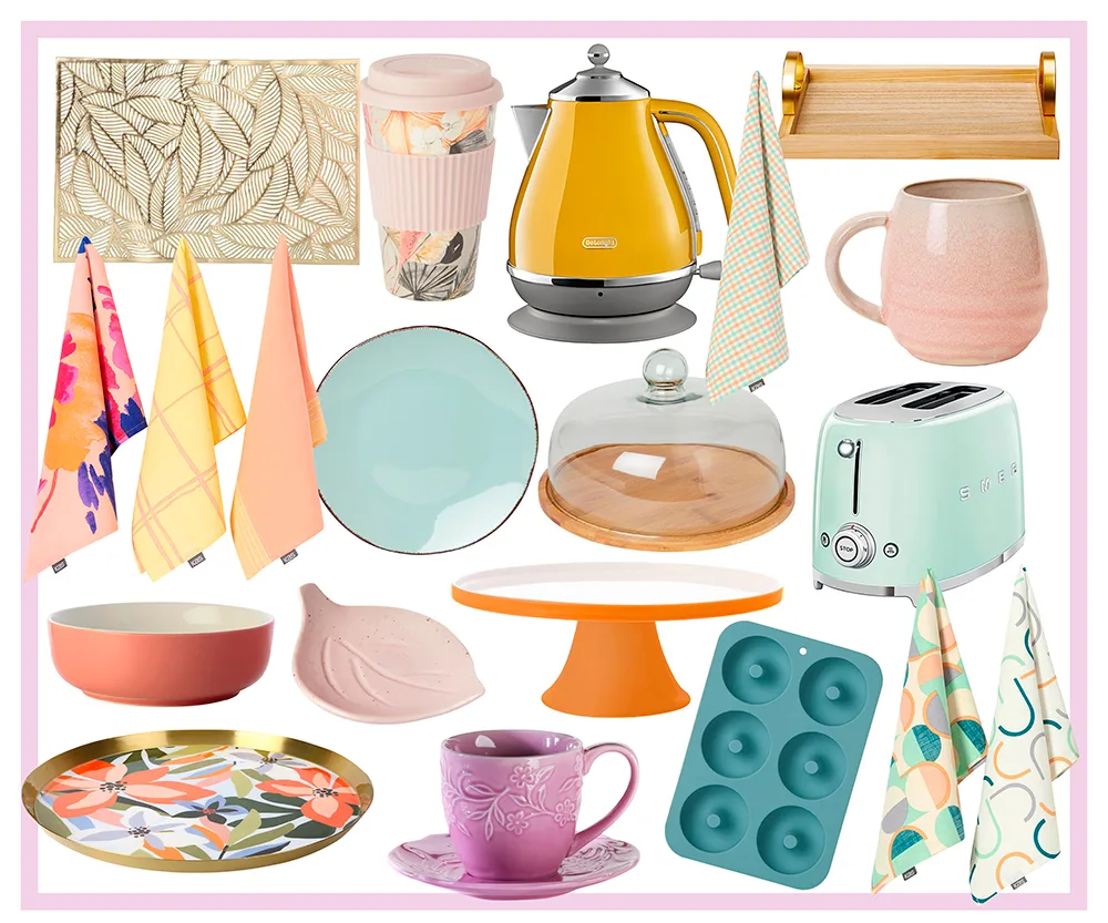 Top row (left to right): Living & Co boho placemat, The Warehouse, $4; Living & Co bamboo travel cup, The Warehouse, $9; DeLonghi Icona kettle, Farmers, $189.99; KAS Mari tea towel 3pk, Briscoes, $34.99; Living & Co wooden tray, The Warehouse, $18; Living & Co mug, The Warehouse, $6.