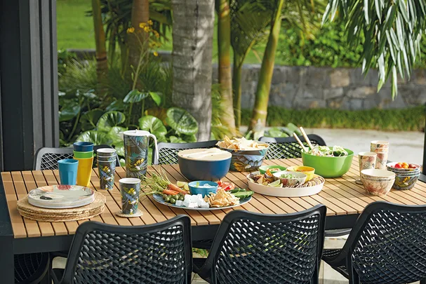 Top of the list should be an outdoor table setting. The Warehouse has a great range for families of all sizes. Go for a set or opt for a table of your choice, then mix and match your chairs to suit your design taste. This summer, we’re seeing bold colours and graphic botanical prints coming through in outdoor styling and serving items – there’s everything from cushions and cups to plates and platters, specifically designed to be used al fresco and all reasonably priced.