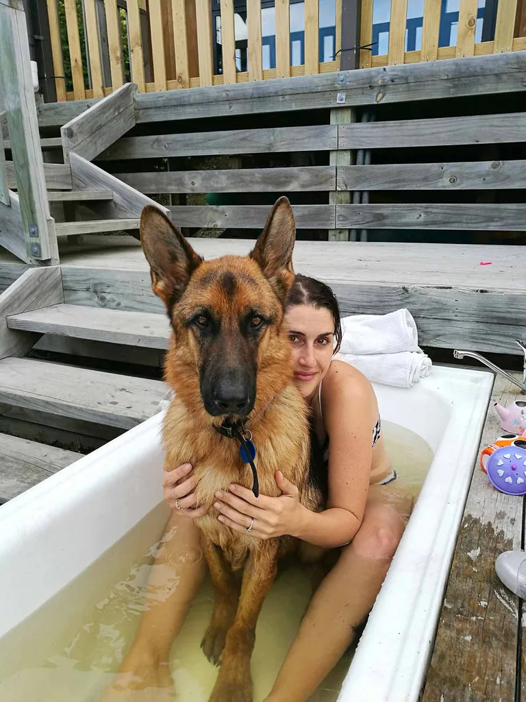 Rico and Nadine enjoy an outdoor bath after finding a pet-friendly place to stay.