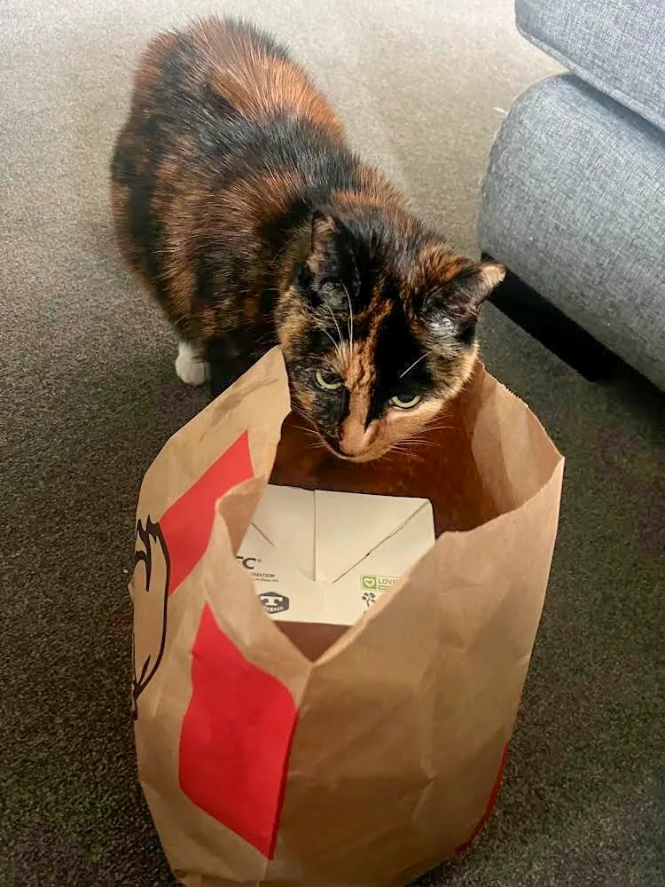 Getting Muffy was a flatting decision. “We got her for only $26 with a free cat carrier!”