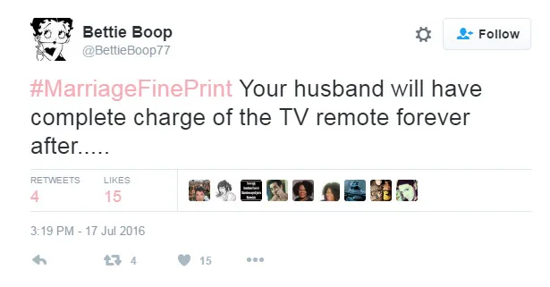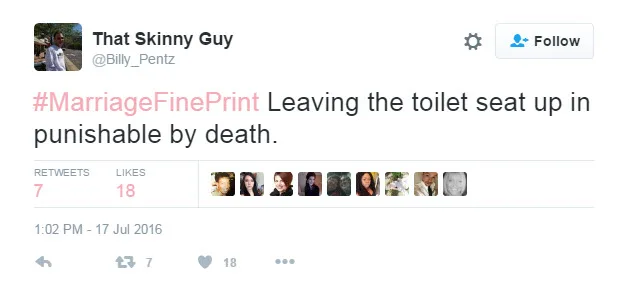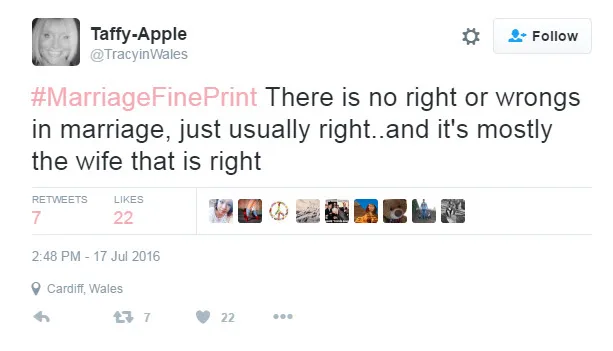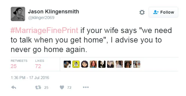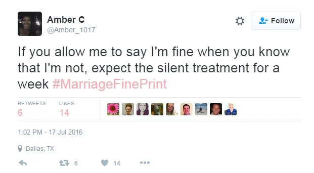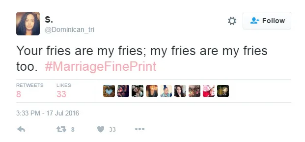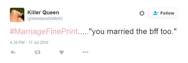 What do you think should be included in the ‘marriage fine print?’ From marrying into their family, to him having to accept her best friend knowing everything – Twitter users have been sharing what they wish they’d known before signing the deal.