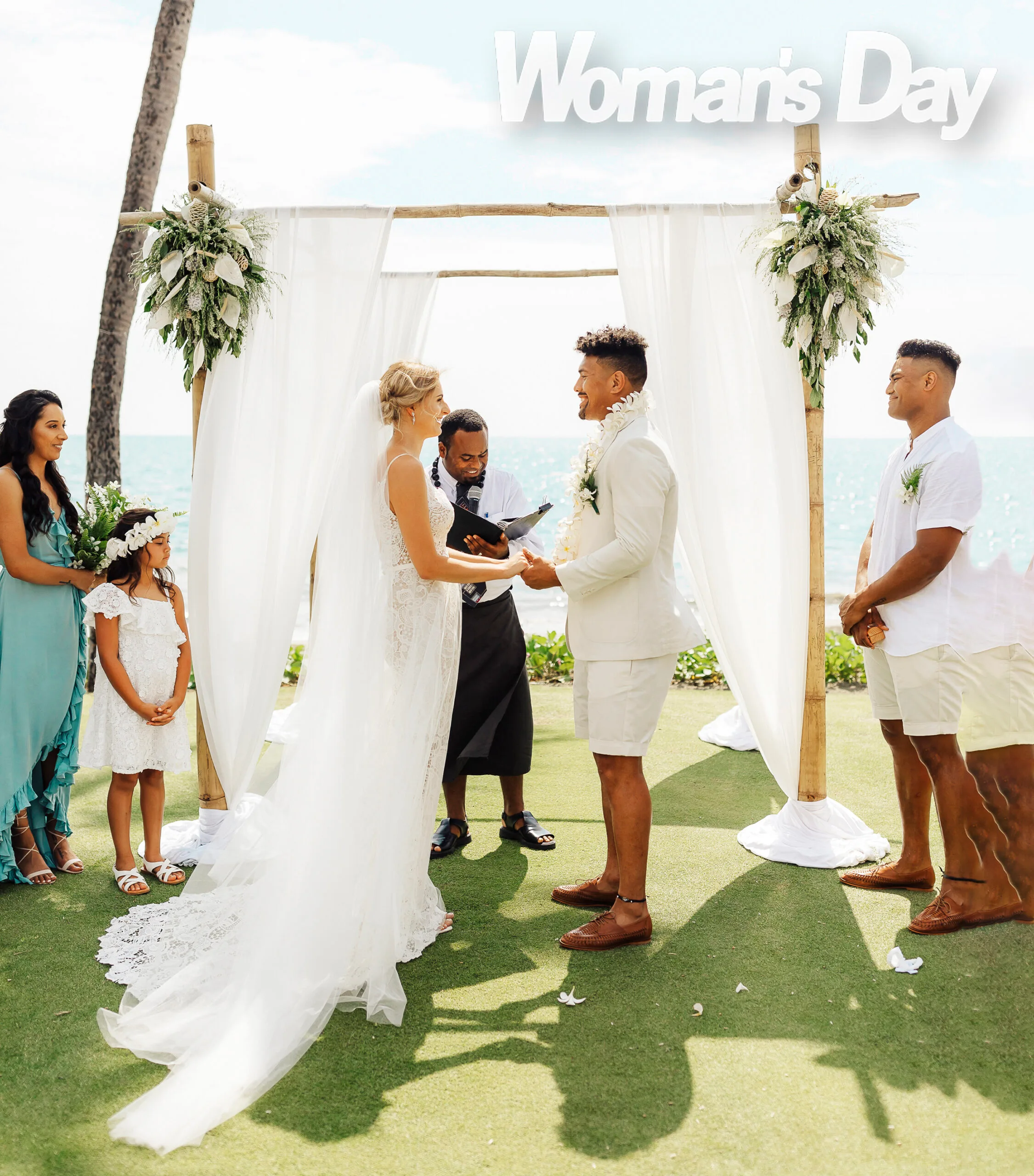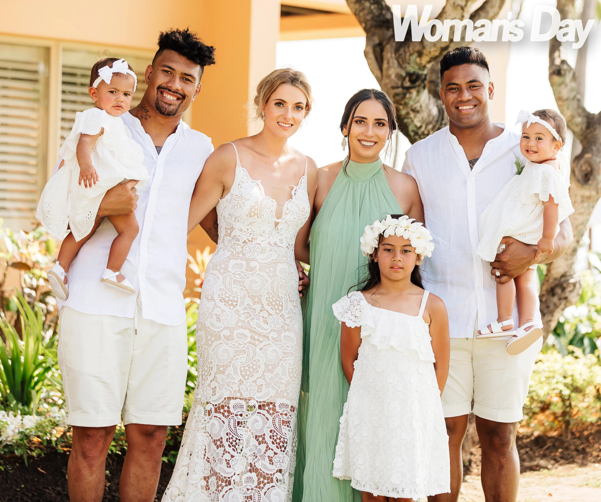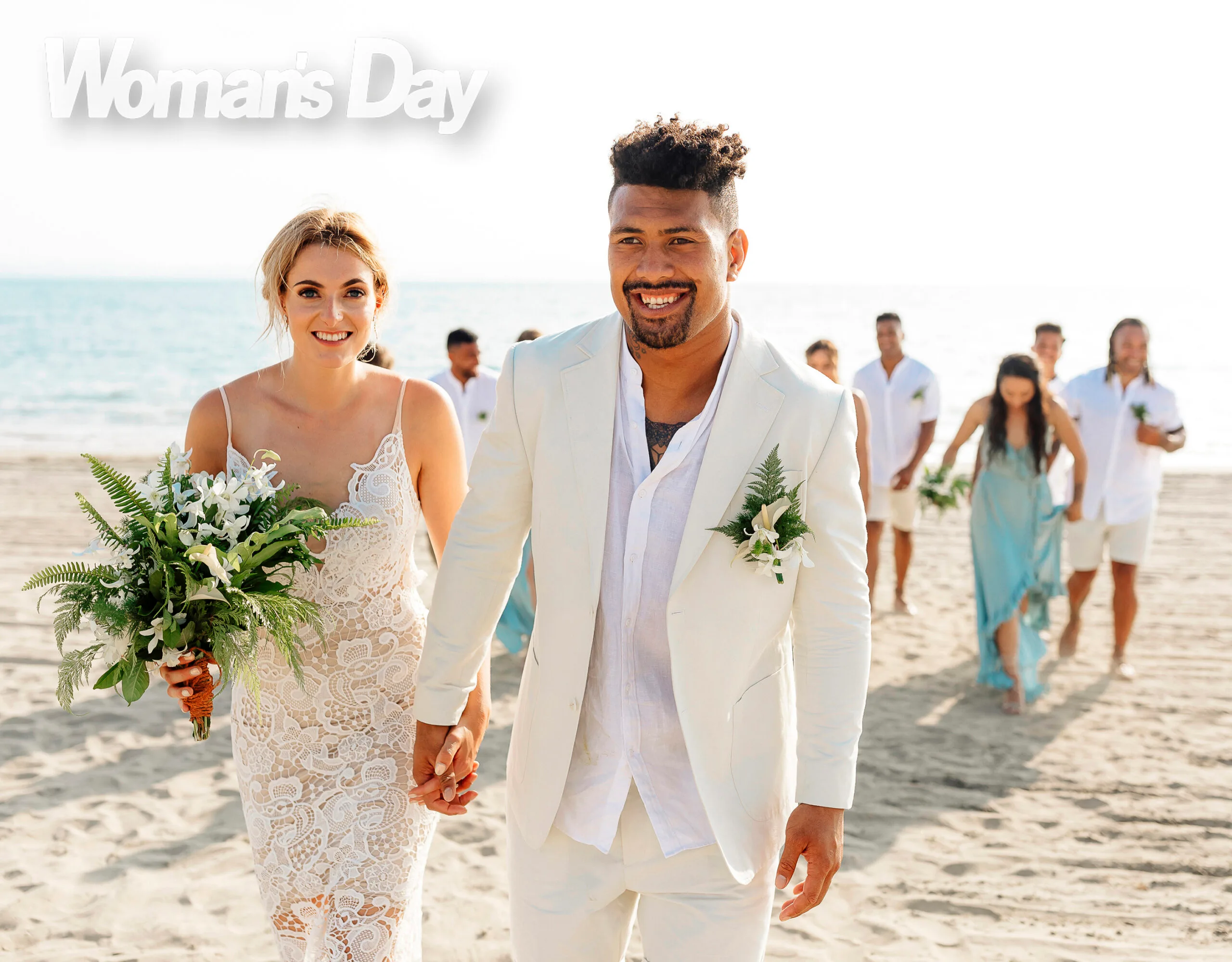 With his baby daughter Kobe in his arms, and his brother and former teammate Julian by his side as best man, emotional All Black hero Ardie Savea couldn’t help but well up as he watched his beautiful bride and high school sweetheart Saskia Hartmann-Hechenberger emerge on to a Fijian beach in a fairytale white gown.