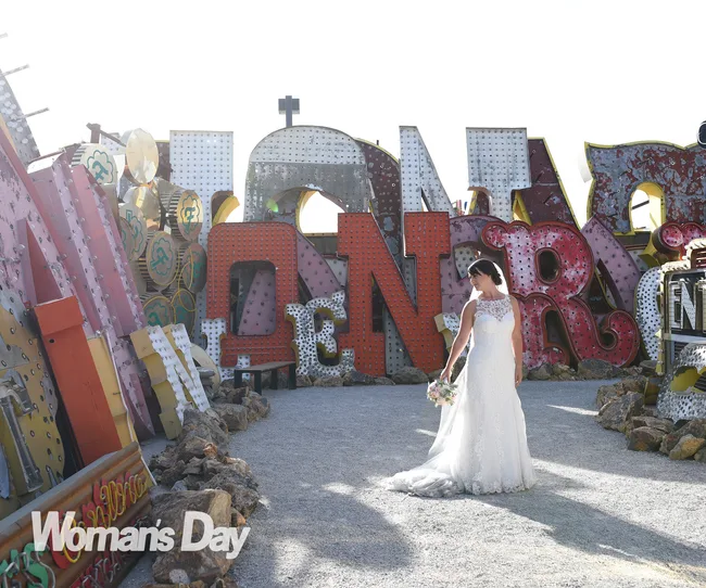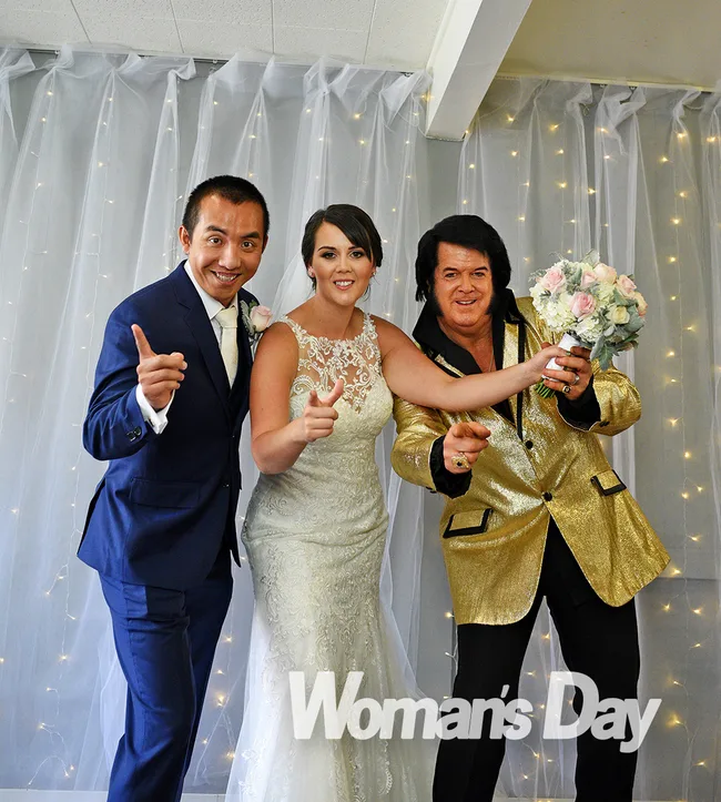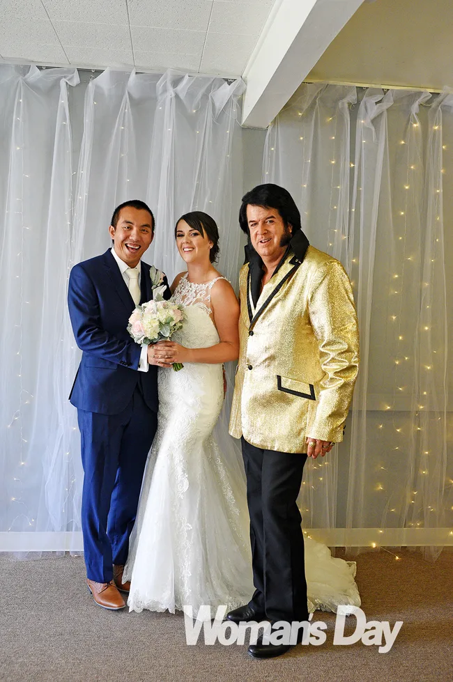 But as the celebrant, an Elvis Presley impersonator, belted out “Can’t Help Falling in Love”, the bride arrived in a gorgeous lace Maggie Sottero gown from Astra Bridal.