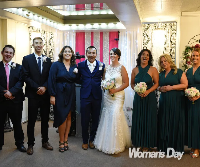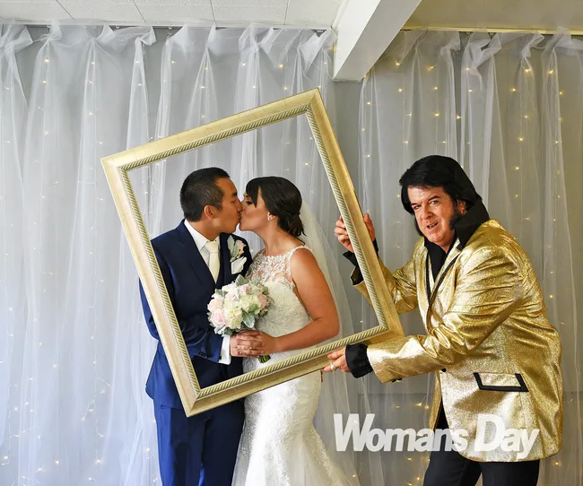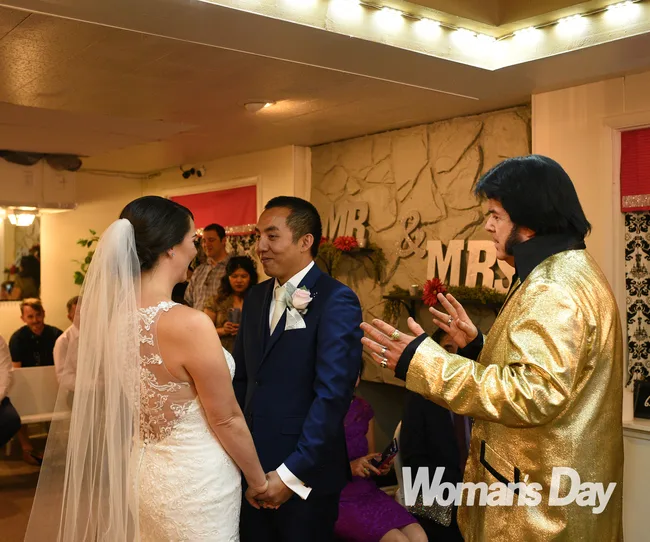 As the pair exchanged rings, they repeated after Elvis, “I give you this ring as a symbol of my hunk of burning love.” When Chang was asked to tell Victoria he’d always “love you tender”, he quipped, “Tinder? We did meet on Tinder, yes.”