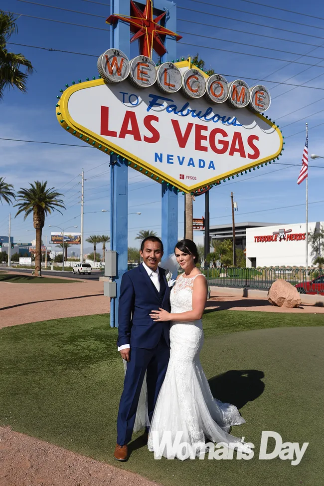 The happy couple pose in front of the landmark Vegas welcome sign.