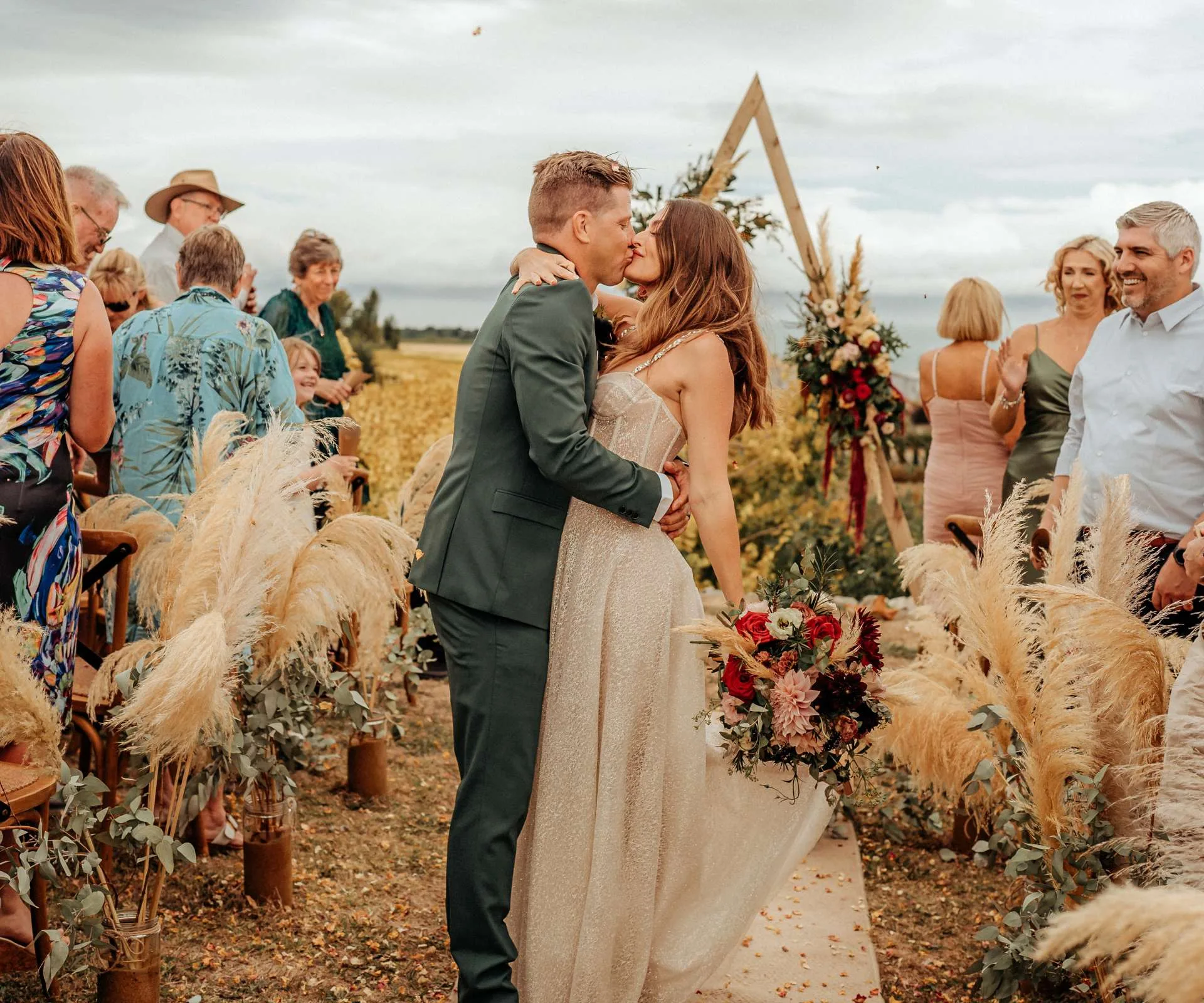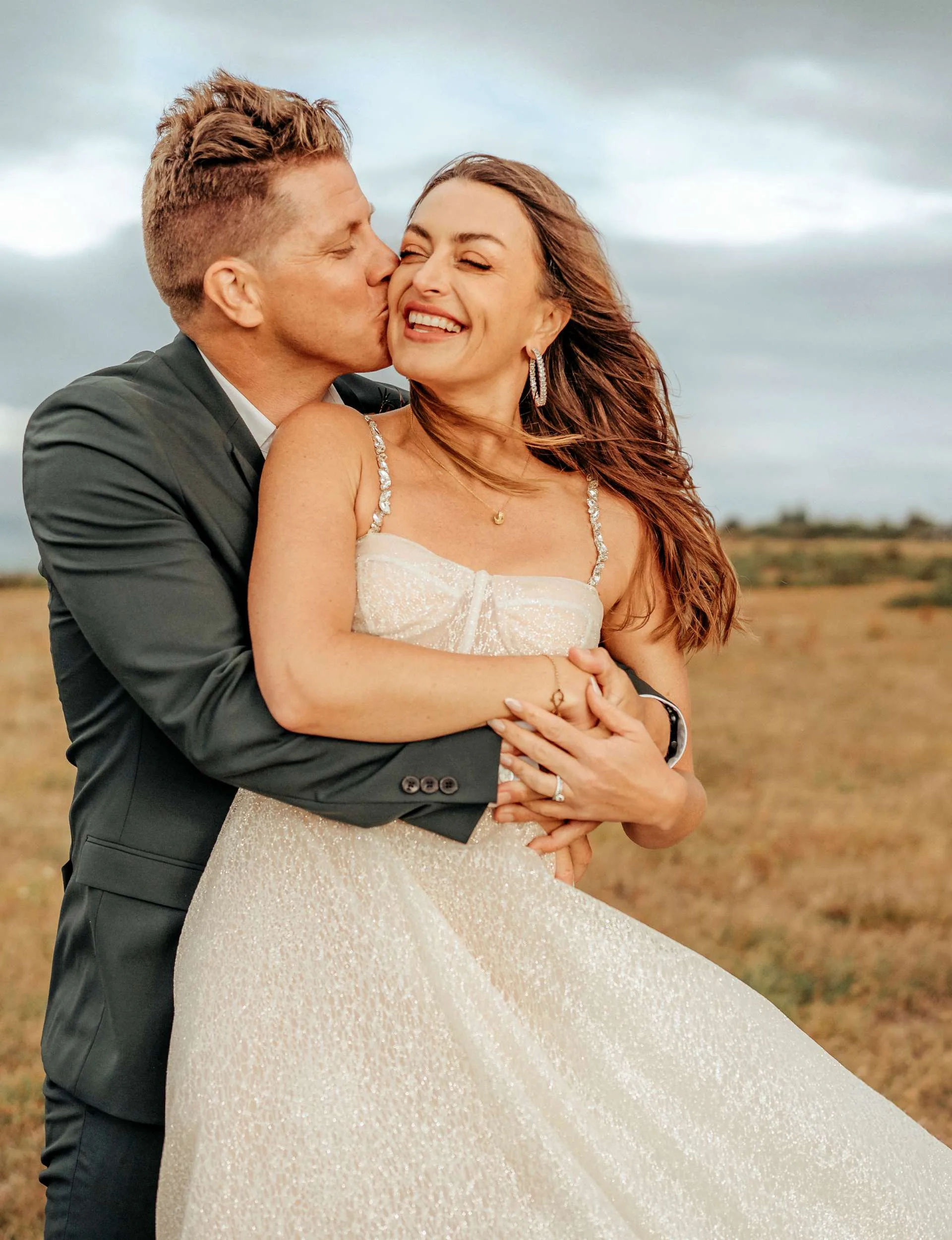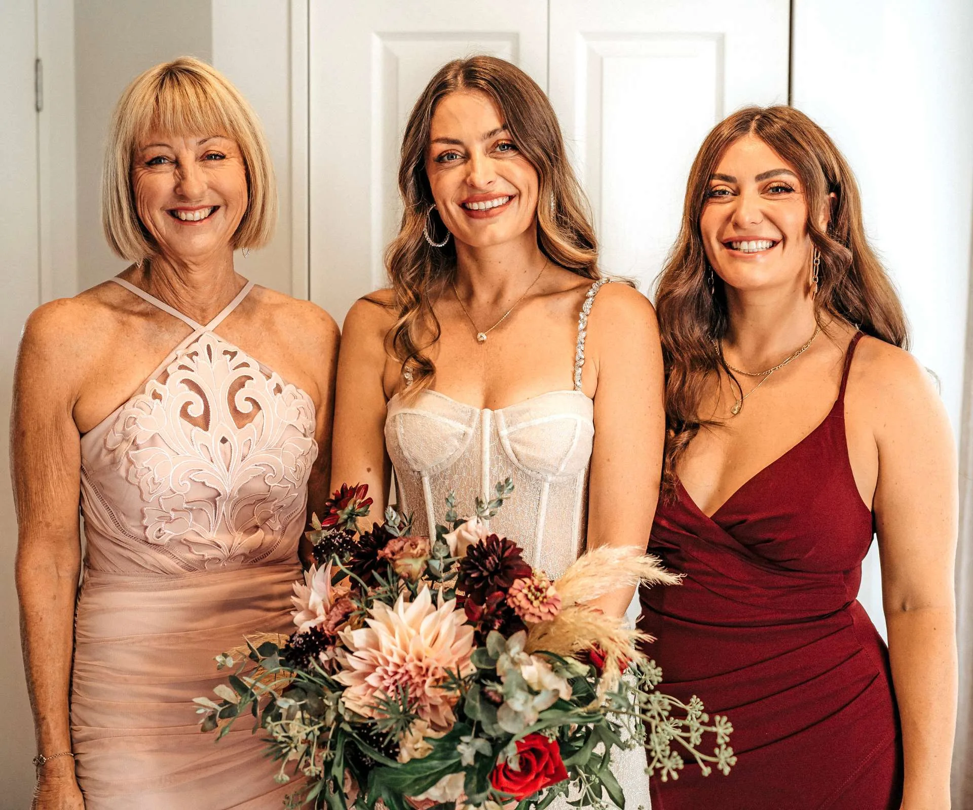 Finding that her dream gown from Berta cost $12,000, Deb searched for a more affordable version. She thrilled to discover a similar dress in the label’s budget range, Jolie. Kieron and Janine, an LA-based musician, walked her down the aisle. “I’m so grateful for my mum and sister’s amazing support,” says Deb.