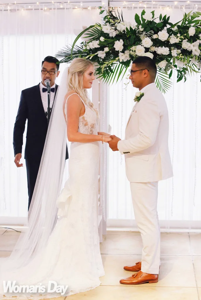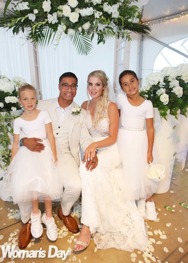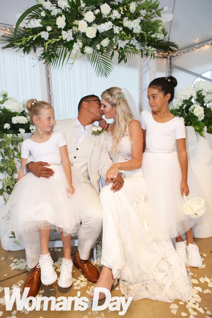 Later, Lizz tells us, “I’m so happy it’s official. We’ve always been committed to each other and don’t really need a piece of paper, but it’s so important to do this in front of friends and family, and for our girls, who are excited about having an actual stepmum and stepdad. It feels good to be Mrs Magasiva.”