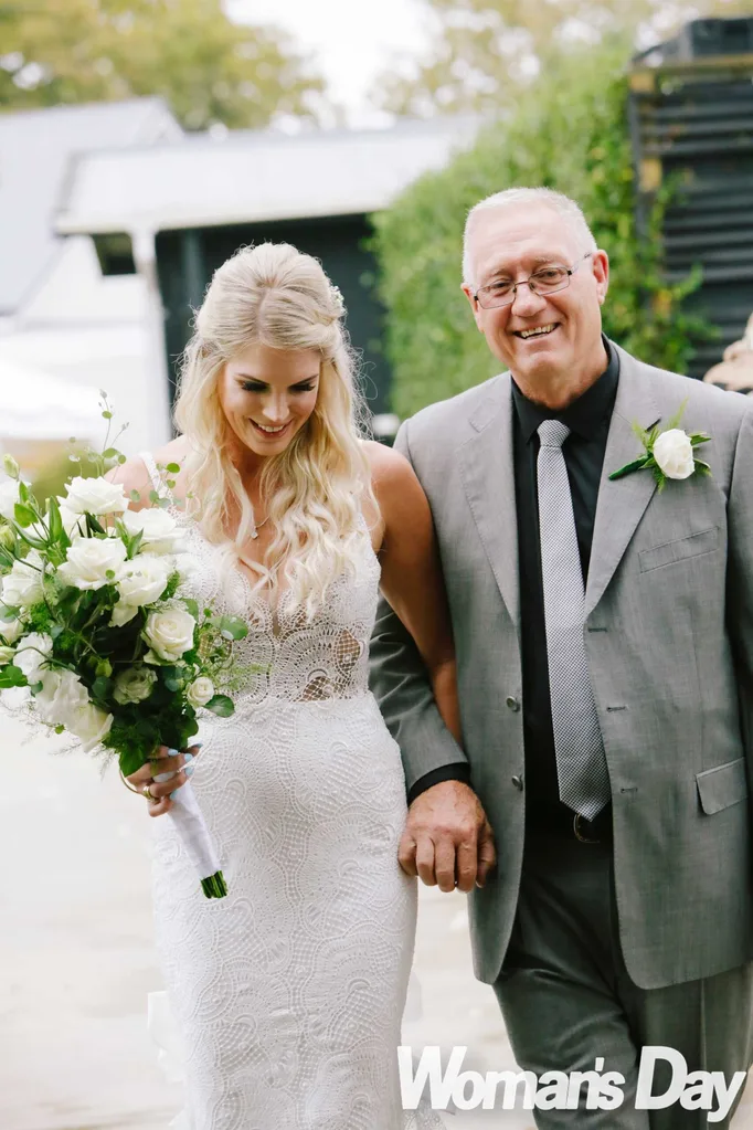 The bride arrives on the arm of her proud dad Ron Sadler.