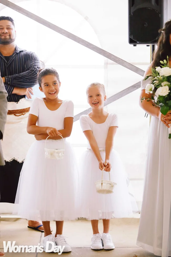 But the tears aren’t over yet. As Pua, in a custom white linen suit from Hallensteins, and his groomsmen wait at the altar, the best man, Pua’s cousin Fa’atonu Fili, sings a tune he wrote about the bride and groom’s relationship. “Though we’ve had some ups and downs, we’ve made it through somehow,” he croons while the gorgeous tutu-clad flowergirls, Pua’s daughter Jasmine, seven, and Lizz’s girl Laylah, six, sprinkle white rose petals down the aisle.