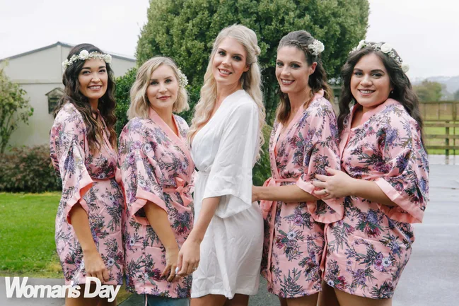 The bride with (from left) Pua’s sister Trina, friends Hayley Williams and Ariki Fotheringhame, and Lizz’s sister Virginia Peek.