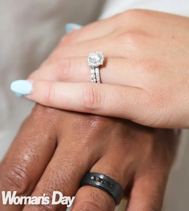 Pua’s ring is black titanium with five black diamonds. Lizz’s is a platinum band to go with her engagement ring.