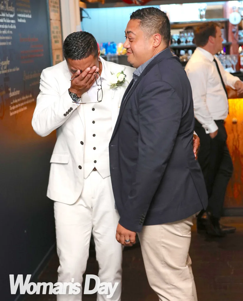 However, moments later, the groom collapses against a wall in tears. Amid the crowd of guests, the Shortland Street actor and Flava radio host, 37, has spotted his twin brother Tanu, who had been scheduled to undergo heart surgery in Wellington and wasn’t going to attend.
