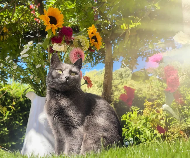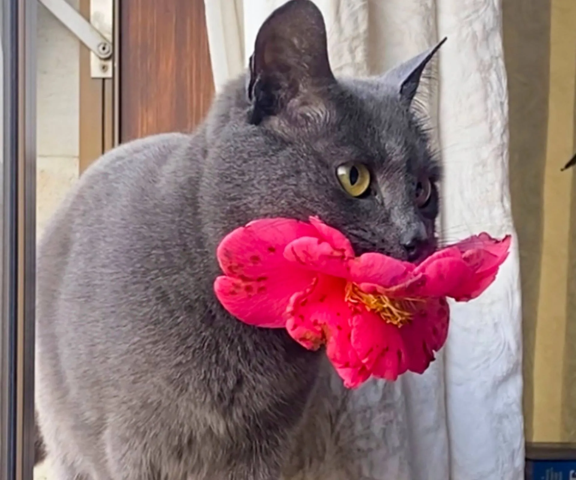 It was several days – and floral deliveries – later before the covert florist was revealed to be Fiddy, a new friend who’d been visiting their yard on the regular. She was spotted in the act – jumping through the window with a camellia in her mouth.