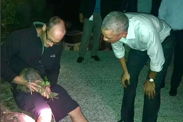 Former US President Barack Obama got up close and personal with New Zealand’s native bird during his visit to Northland on Wednesday.