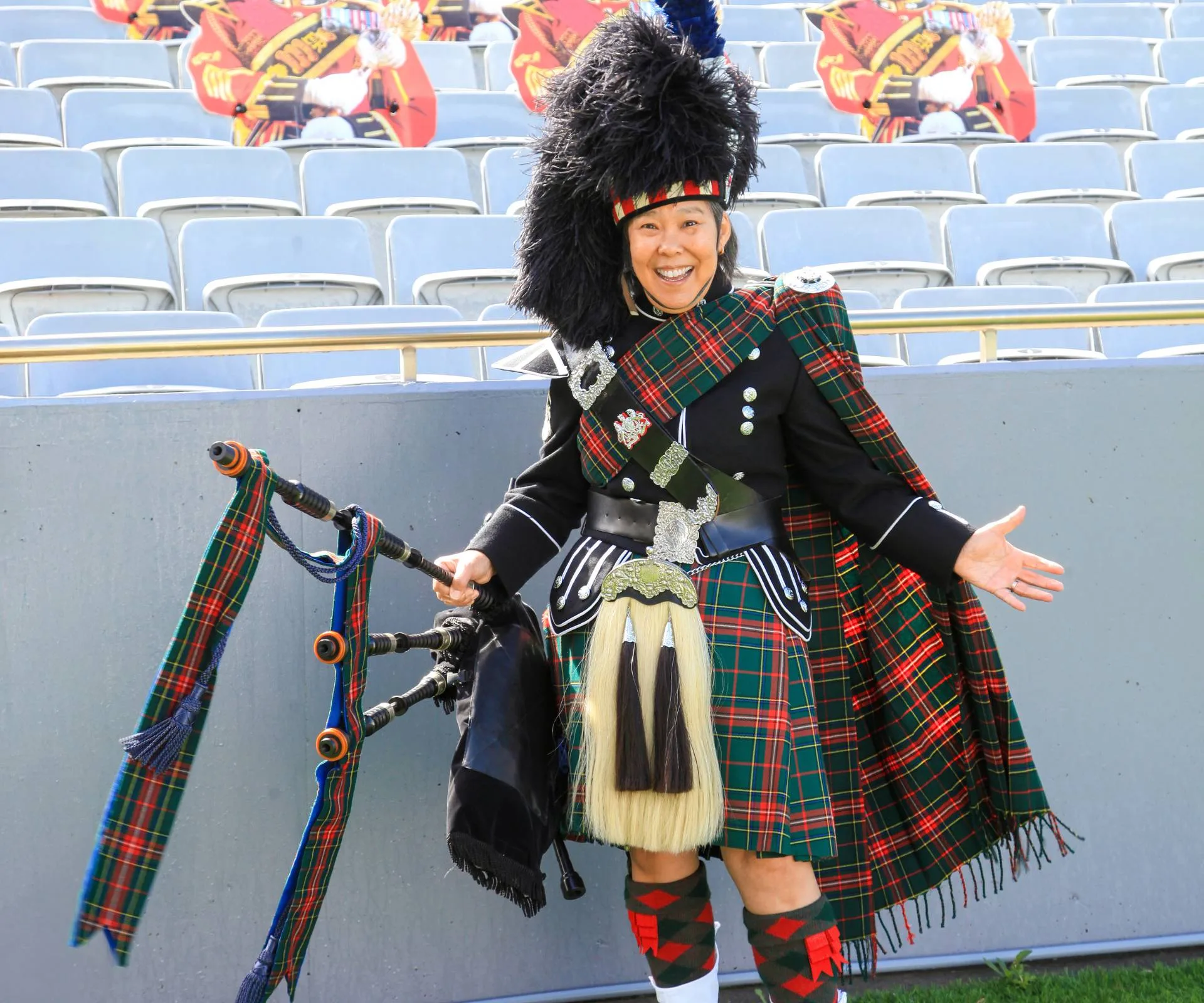 “Another time, after a big downpour of rain, some of our players had plastic Tesco bags over our feather bonnets while we were standing around. British actor Hugh Grant made a comment to one of them, ‘That’s a great look!’ He had a chuckle and moved on.”