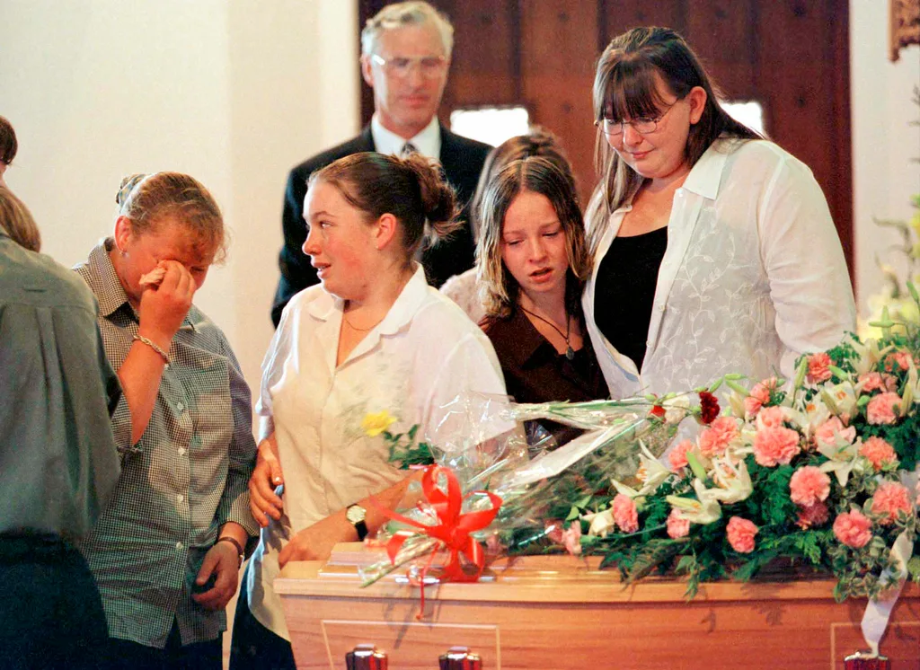 Lee-Anne (far right) grieves with her friends around Kirsty’s coffin in 1999.