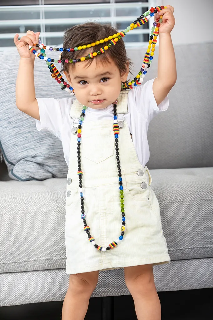 Mae proudly showing off her cancer beads of courage
