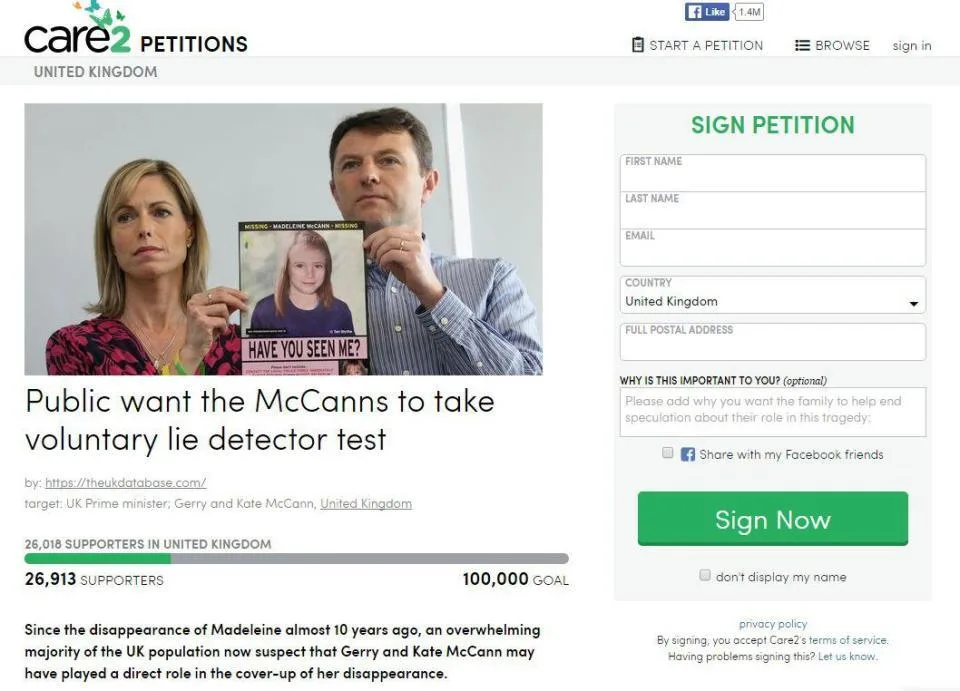 An online petition is demanding Kate and Gerry McCann take a lie detector test about their daughter Madeleine’s disappearance.