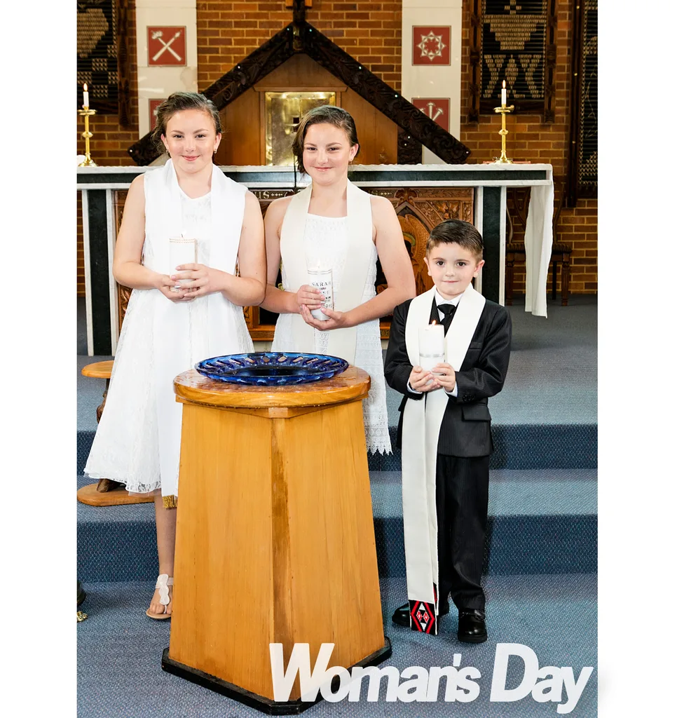 But the day is about to get even more special for the three beaming kids. As they pose for pictures at the baptismal font, proud mum Melissa excuses herself to go to the bathroom and secretly changes into a stunning white frock that perfectly matches the pretty dresses picked out by her 12-year-old daughters for the occasion.