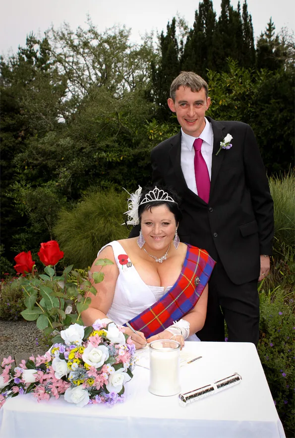 Laura’s “something old” was her grandfather’s army medal, which she pinned to her tartan sash – “something blue” – and the “something old” was her favourite pair of boots. “I don’t do anything by tradition,” says Laura.