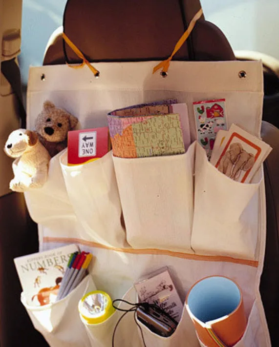 A shoe rack hung over the back of car seats makes a great organiser for long journeys. Pop in all their favourite toys, gadgets and books.