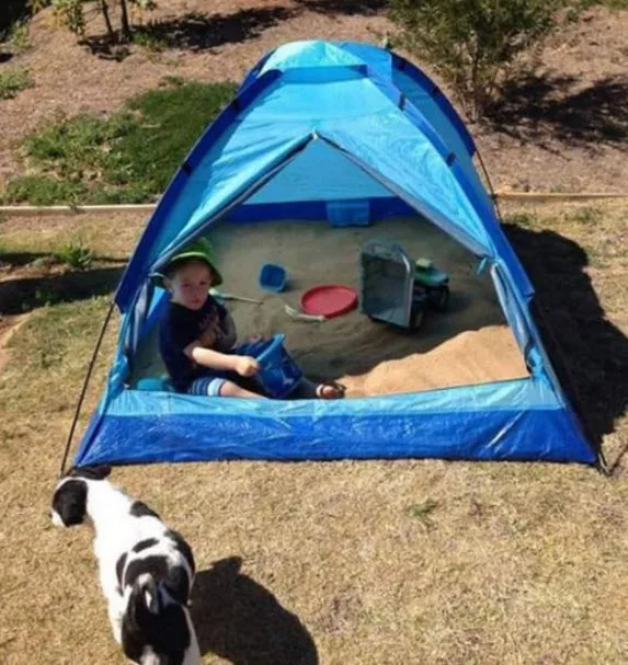 A tent filled with sand might seem fussy, but it’s a good way to shield them from the summer sun while keeping them busy.