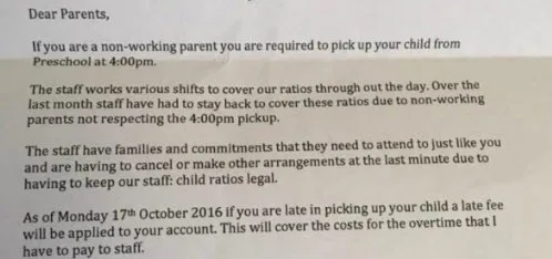 “If you are a non-working parent you are required to pick your child up from Preschool at 4:00pm,” the letter reads, before outlining that those who arrive late are costing the company in overtime wages.