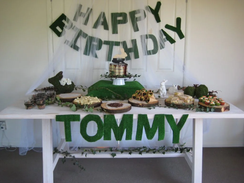 I wanted a natural feel to the decorations with lots of greens, browns, wood and white. The ‘Happy Birthday’ banner looked so gorgeous and I loved it. I cut the letters from artificial grass from Bunnings. The net hanging over the table was perfect to soften the look and the vines, white hydrangeas, carrots, wooden slaps, leaves and foliage added a lovely natural element.