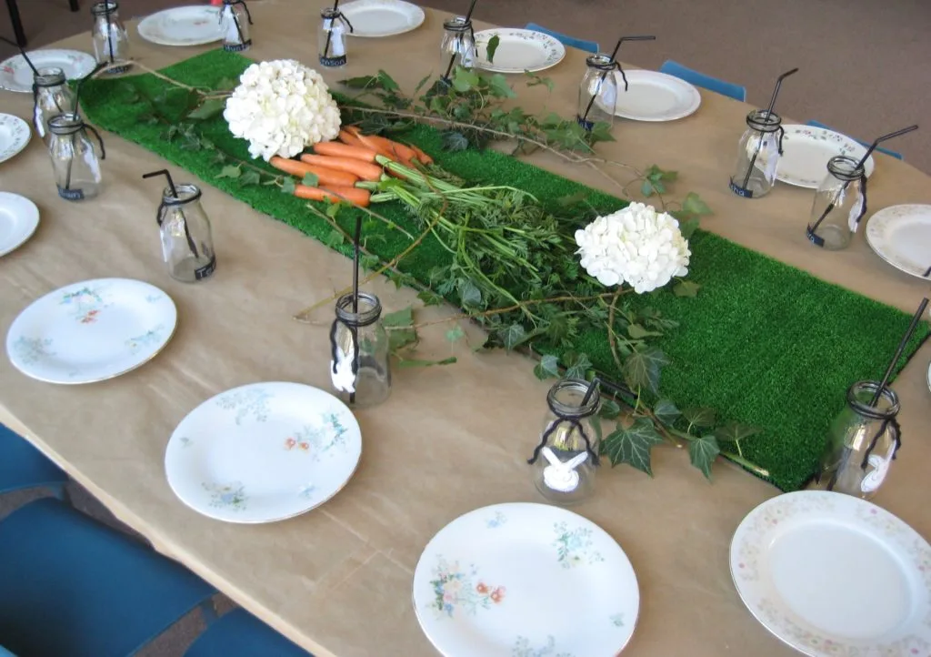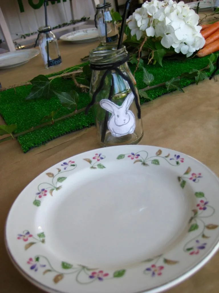 I used some brown wrapping paper to cover the kid’s table and decorated it with a grass table runner. I’d been gathering a collection of beautiful vintage plates from op-shops and these were perfect to serve the kids food. A great option for sustainable kids parties. I glued some fabric bunnies to my milk bottles from lovely material purchased at Spotlight. I looped a tie of black wool on them, labeled them with the kids names using a black sticker and popped a black straw in to match.