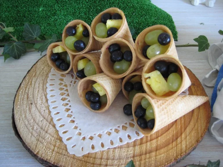 I used small waffle cones perfect size for kids to hold fresh fruit; grapes, blueberries and pineapple.