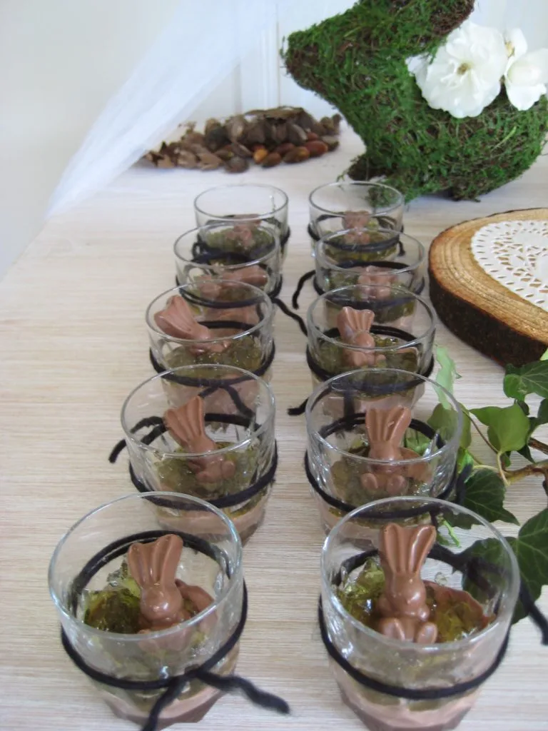 In glasses, fancied up with a tie of black wool, we served chocolate mousse for ‘dirt’ with green jelly ‘grass’ and a chocolate bunny sitting on top. These were a hit.