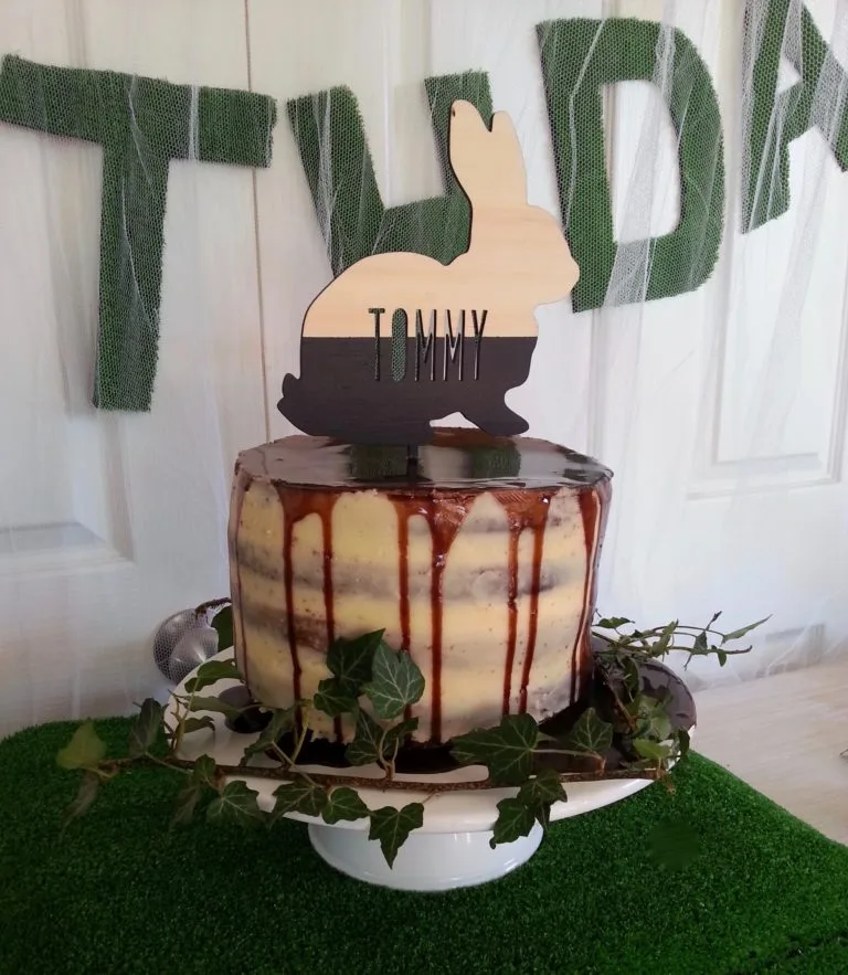 I’ve been admiring semi-nude cakes lately and love the use of natural foliage with them. We made two vanilla cakes cut in half to make the four layers and iced them in a buttercream frosting. A chocolate ganache was drizzled over the top. ‘Daddy Cake Baker’ worked his magic to make the cake look stunning. The custom-made cake topper from clever mum Kylie at Love From Seventeen finished it off perfectly. Love From Seventeen offers ‘stylish family-crafted children’s and interior décor, dreamt up and designed in the heart of Southland, New Zealand.’