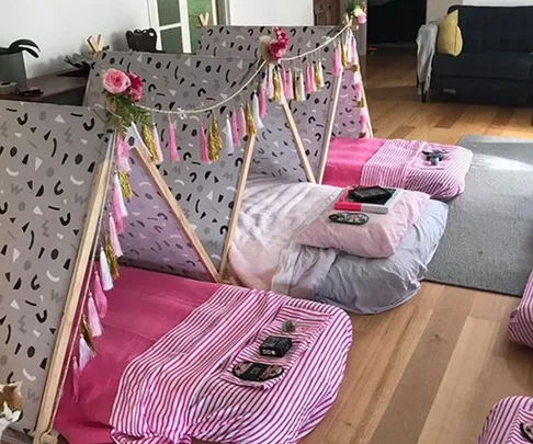 Instead she turned to her local Kmart, buying play tents, airbeds, twinkle lights and garlands to create a dreamy slumber party set-up.