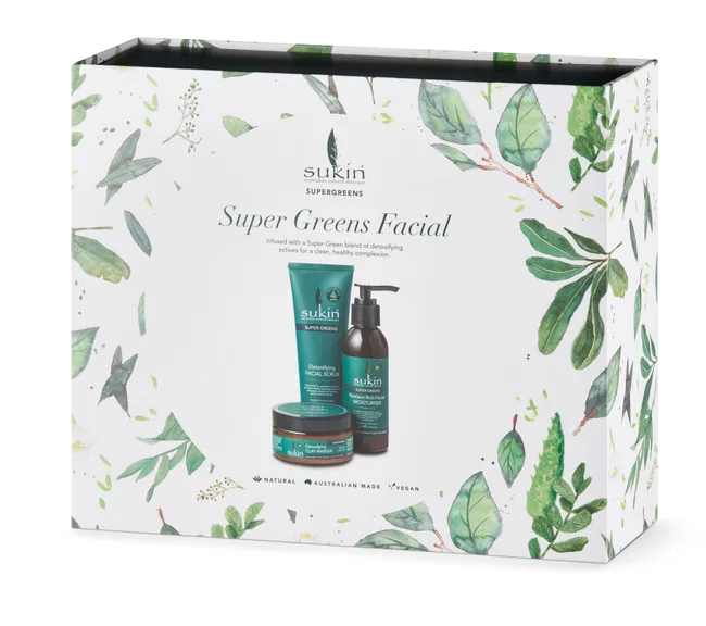 Freshen up your skin with the Detoxifying Scrub, Indulge with Sukins Super Greens clay based masque & Nourish with the lightweight Nutrient Rich Facial Moisturiser. This Super Greens blend of Kale, Spirulina, Parsley and Chlorella are combined with nourishing Acai, Goji and many more to leave a clean, brightened and revitalised complexion.
