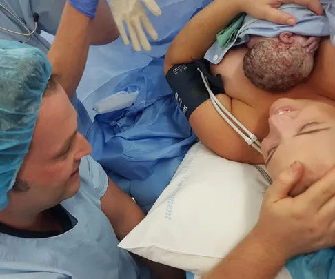 In a maternal assisted caesarean delivery the obstetrician and surgeons begin the procedure, and once the baby’s head is out, the mother can reach down, grab their child under the armpits and pull them up onto their chest.