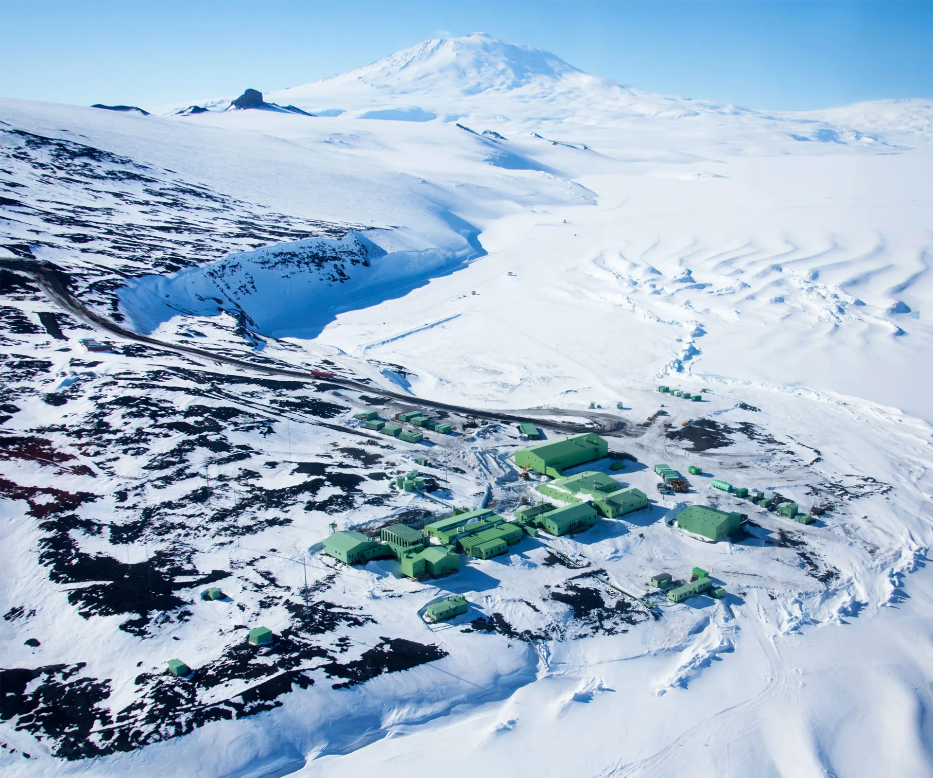 Scott Base with Mt Erebus in the background.