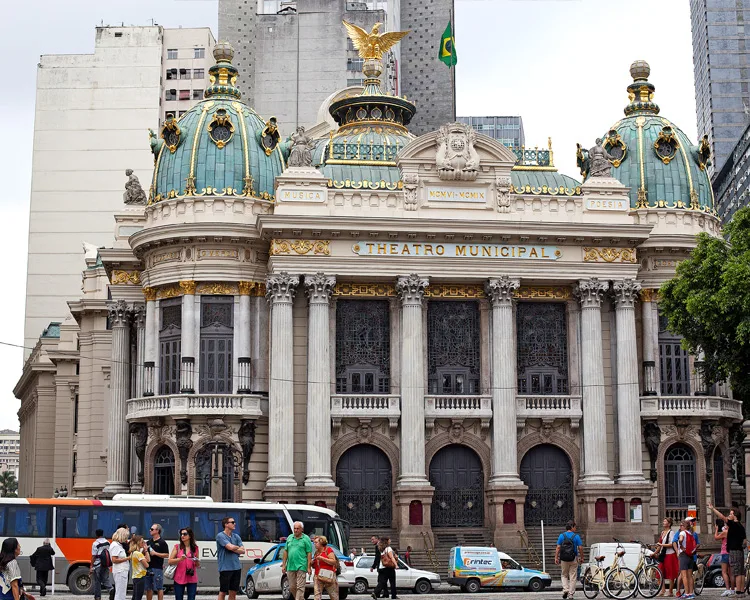 Under the shade of leafy old trees, we walk past food stalls roasting cashew nuts and boiling corn cobs to the ornate Theatro Municipal.